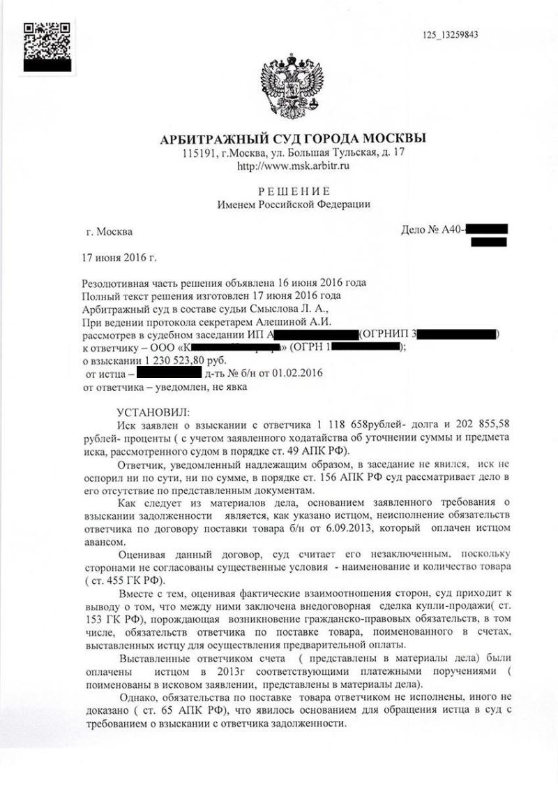 • Взыскание долга по договору поставки