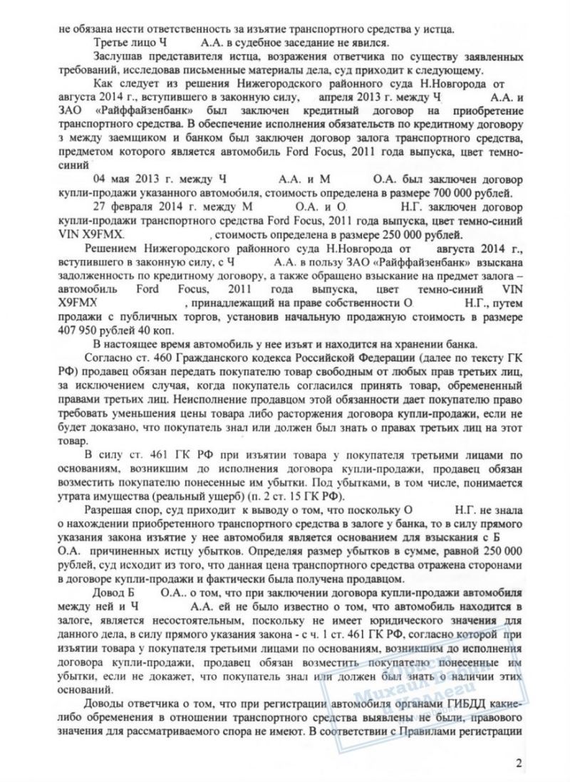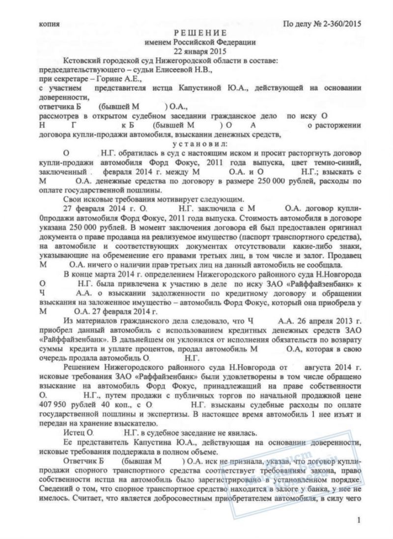 О. не сумела отстоять свои права в споре с банком, однако юрист нашей компании смогла помочь ей, через суд взыскав с предыдущего владельца полную стоимость иномарки.