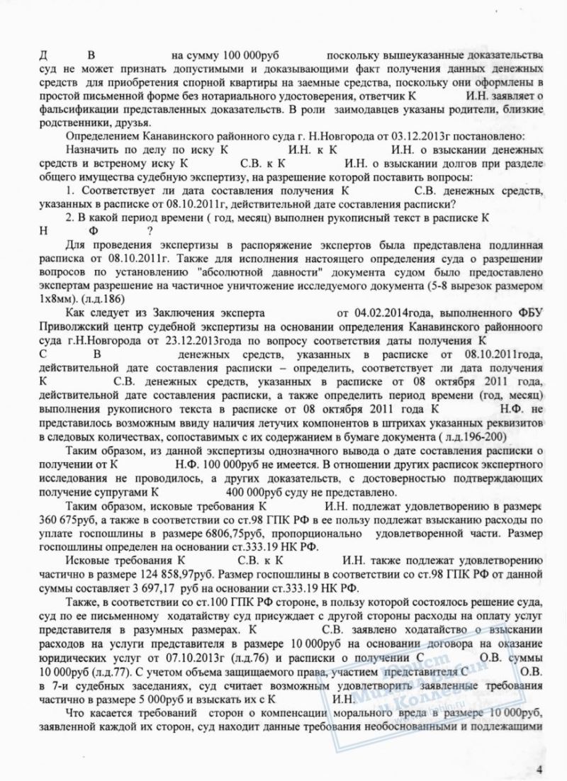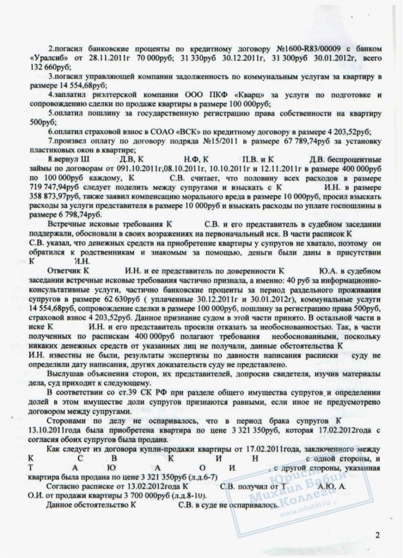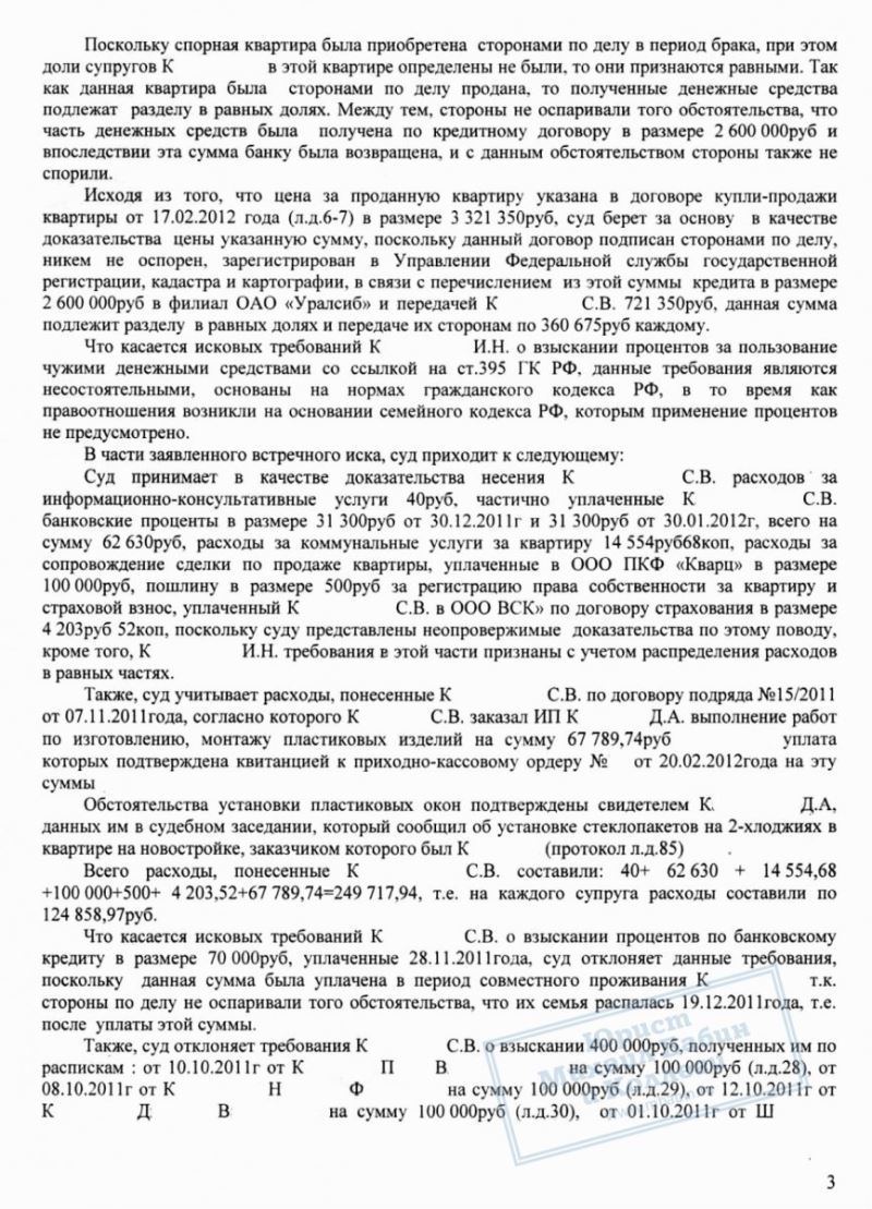 Чтобы вернуть принадлежащую ей часть денег, К.И. вынуждена была обратиться в суд. К.С. не согласился с требованием бывшей супруги, аргументируя отказ единолично оплаченными им расходами на ремонт и продажу жилья. Он даже предоставил суду расписки на 400 тыс. руб. кредита, которые якобы были потрачены на данную квартиру.