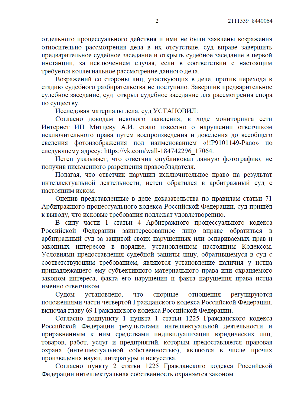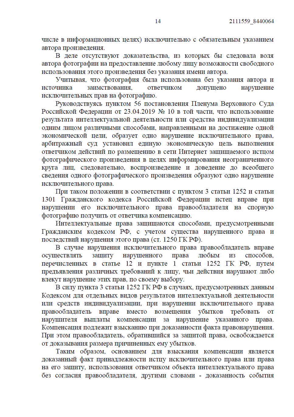 • Мы отказались от минимальных сумм и потребовали компенсацию в двукратном размере стоимости права использования. В качестве доказательства реальной цены была представлена рыночная сделка — лицензионный договор на это же фото, оплаченный сторонним заказчиком.