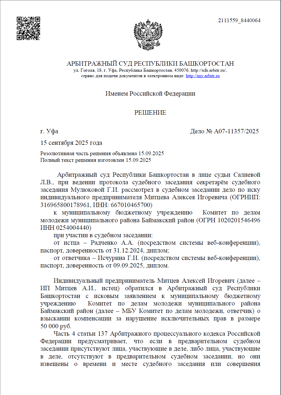 Муниципальный комитет использовал профессиональный снимок фотографа Александра Осипова для оформления своего паблика, считая это «информационной целью». Мы доказали, что даже благородные цели не освобождают от обязанности соблюдать закон, и взыскали компенсацию в двукратном размере стоимости лицензии.