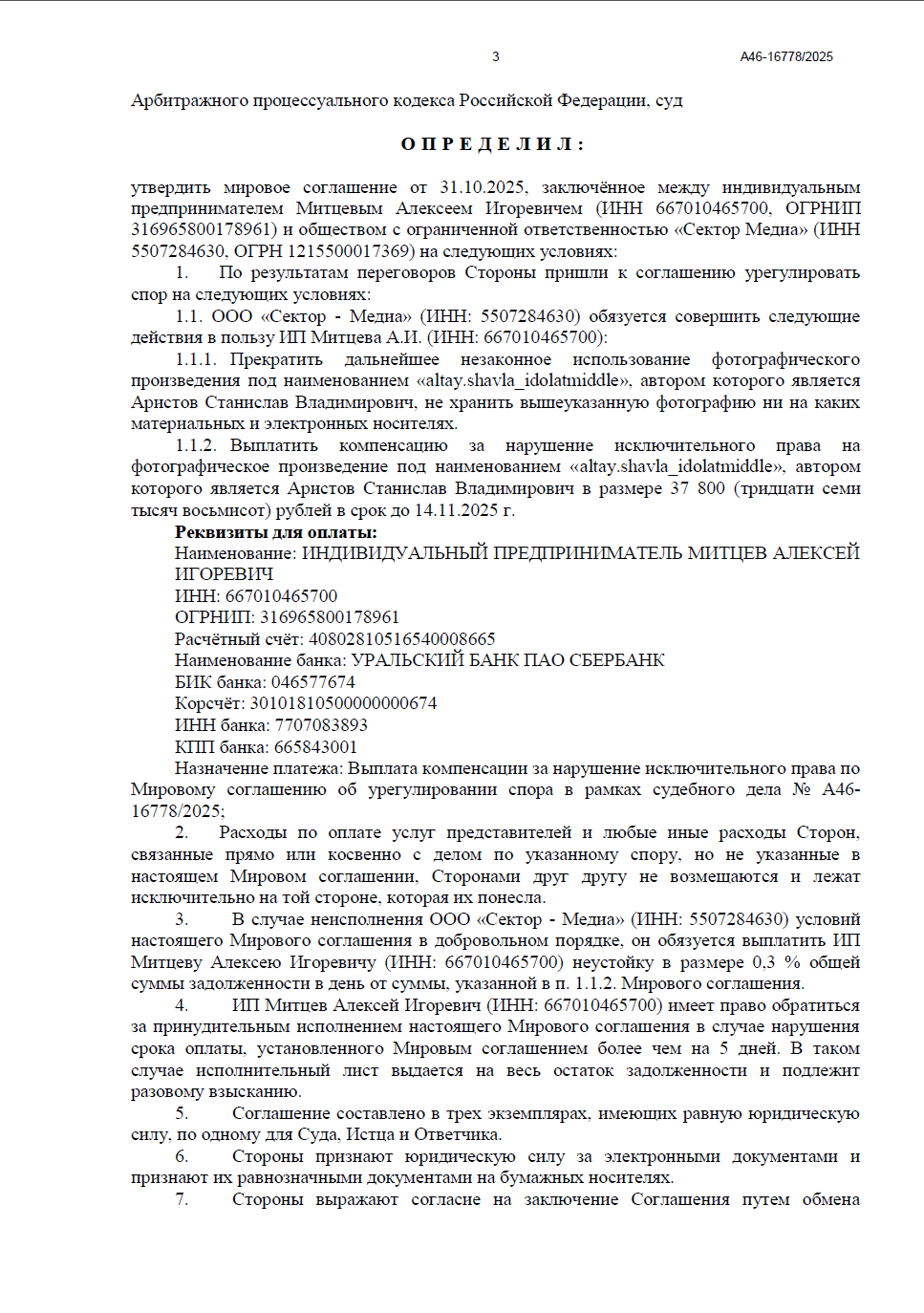 Специалисты нашей компании обратились в Арбитражный суд Омской области с исковым заявлением к ООО «Сектор Медиа». Основанием стал факт неправомерного использования фотографии. Суд принял дело к рассмотрению в порядке упрощенного производства.
