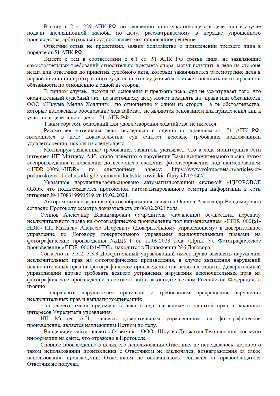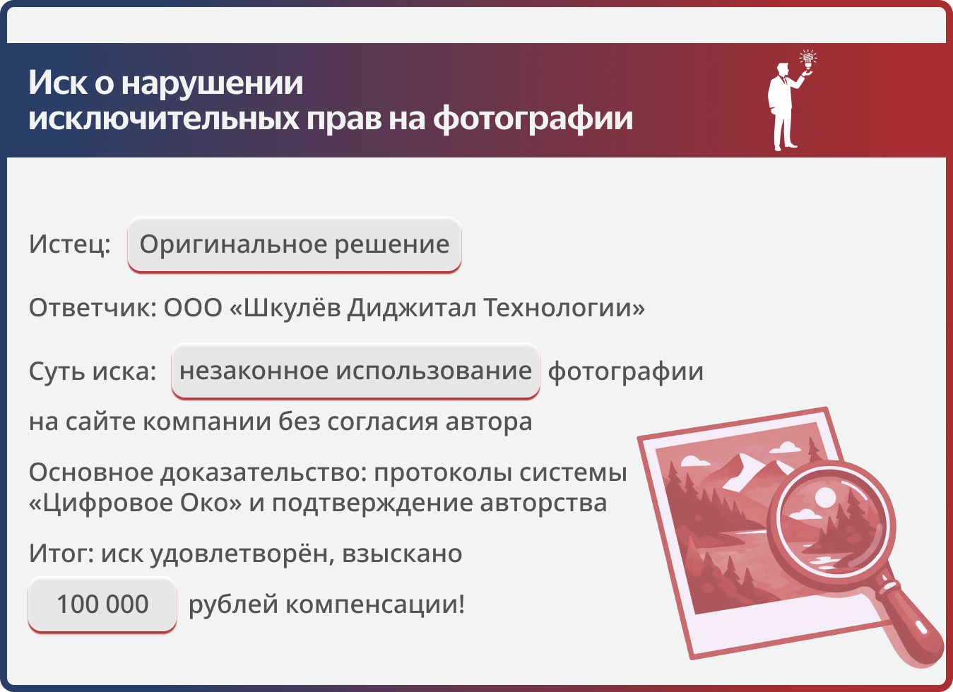 Доказать факт незаконного использования фотографического произведения крупным медиахолдингом и взыскать справедливую компенсацию. Сложность заключалась в подтверждении прав доверительного управляющего на иск и фиксации нарушения, совершенного в цифровой среде.