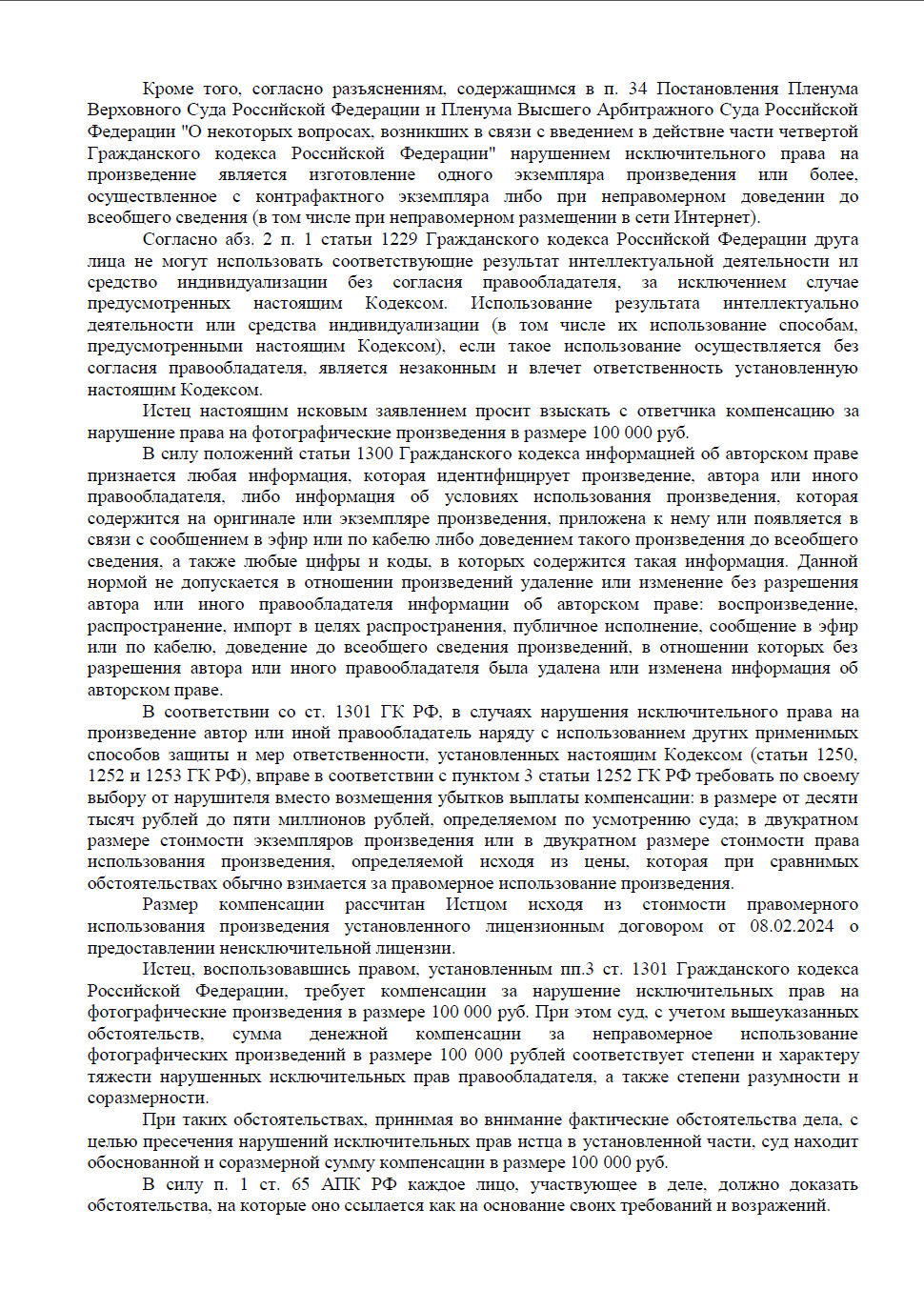 • Размер компенсации в 100 000 рублей был рассчитан исходя из стоимости права использования, установленной реальными лицензионными договорами.