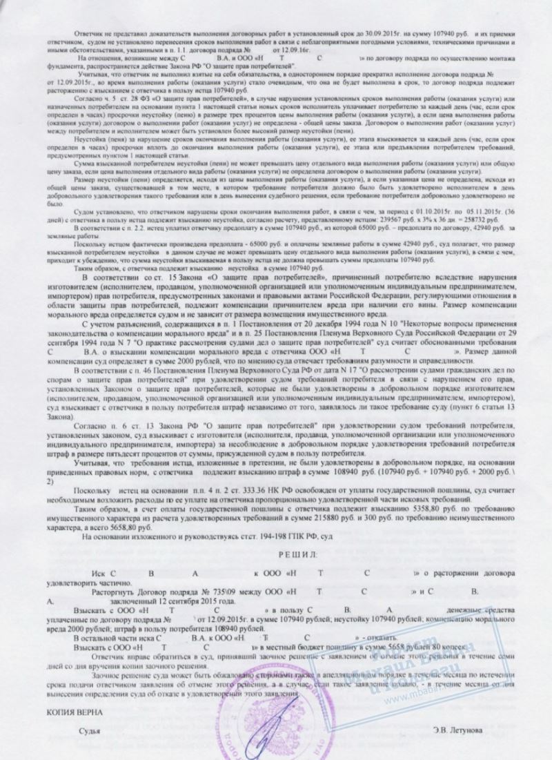 Наш клиент С. решил построить загородный дом и 12 сентября подписал договор со строительной компанией «Н» на заливку фундамента. Срок был установлен до 30 сентября. С. выплатил задаток 108 000 рублей. Однако подрядчик не торопился: работы начались позже, к обещанной дате фундамент готов не был. Начались осенние дожди и похолодание — заливка бетона стала невозможной, и стройку пришлось отложить на неопределённый срок. С. обратился к нам. Мы посоветовали направить подрядчику письменную претензию с требованием расторгнуть договор и вернуть задаток. Компания «Н» на мировую не пошла. Тогда мы подготовили исковое заявление в суд и отстаивали интересы клиента в рамках Закона о защите прав потребителей.