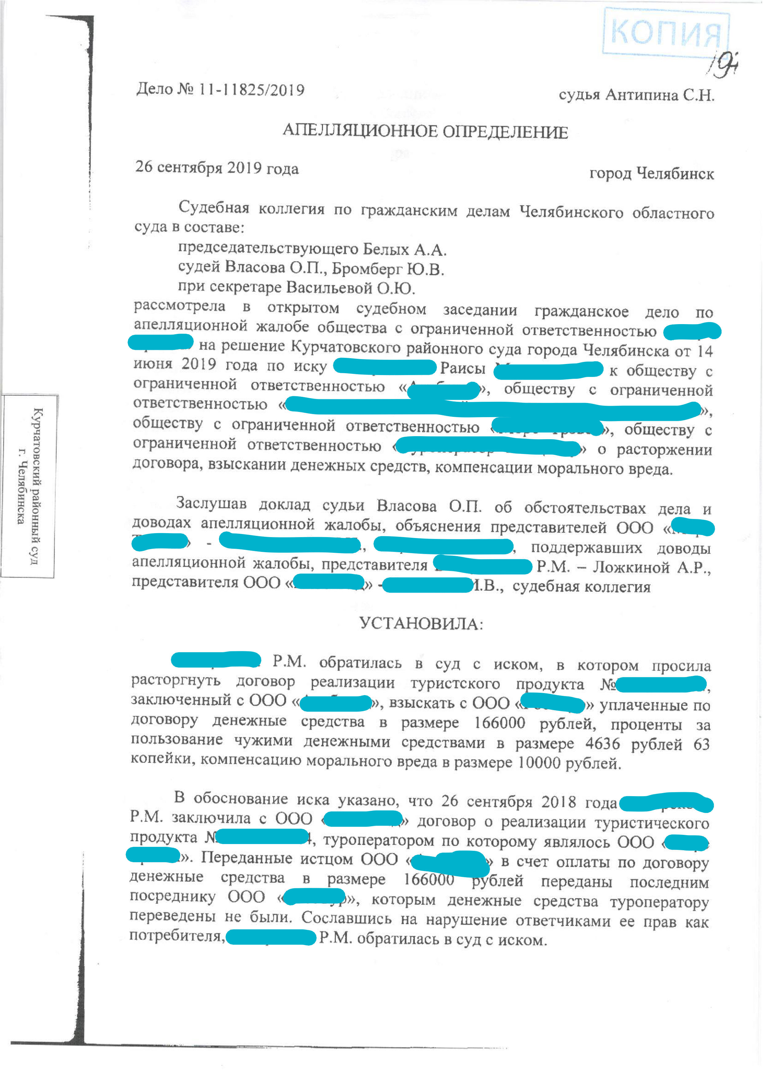 Дело о возврате денежных средств за тур