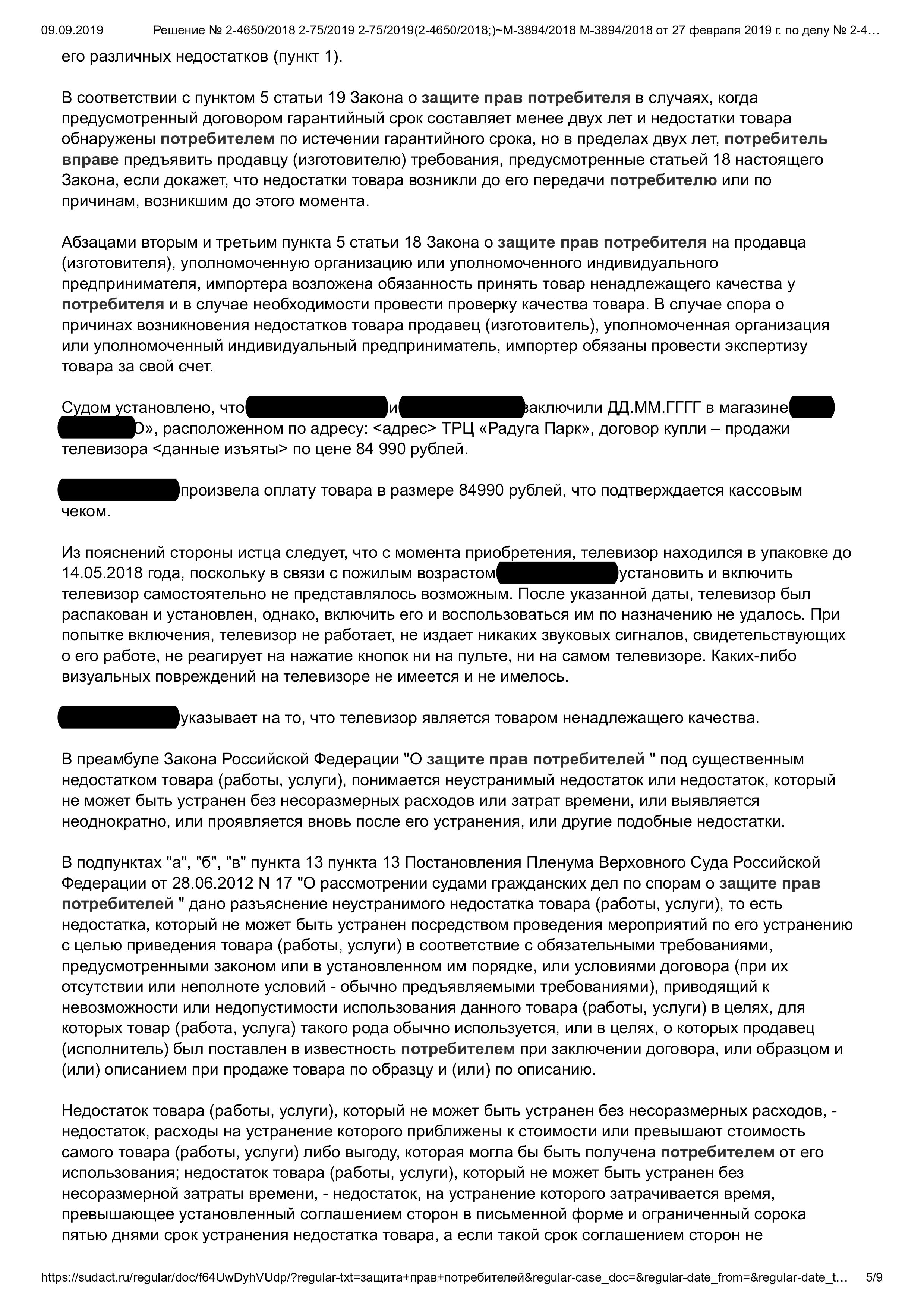 В итоге, в пользу нашей клиентки была взыскана стоимость телевизора, компенсация морального вреда, неустойка, расходы по составлению досудебной претензии, жалоб и заявлений, оплате услуг представителя, почтовые расходы, а также сумма штрафа.